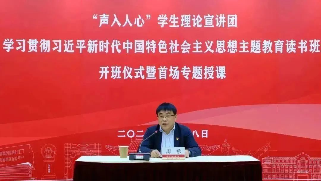 周承对“声入人心”学生理论宣讲团成立以来的成长进步予以高度评价,对宣讲团取得的成果表示充分肯定。他强调本次主题教育读书班要把加强党的创新理论武装作为重中之重,坚持读原著、学原文、悟原理,深刻领悟“两个确立”的决定性意义,坚决做到“两个维护”。要坚持学以致用、知行合一,扎实做好习近平新时代中国特色社会主义思想深化、内化、转化工作。