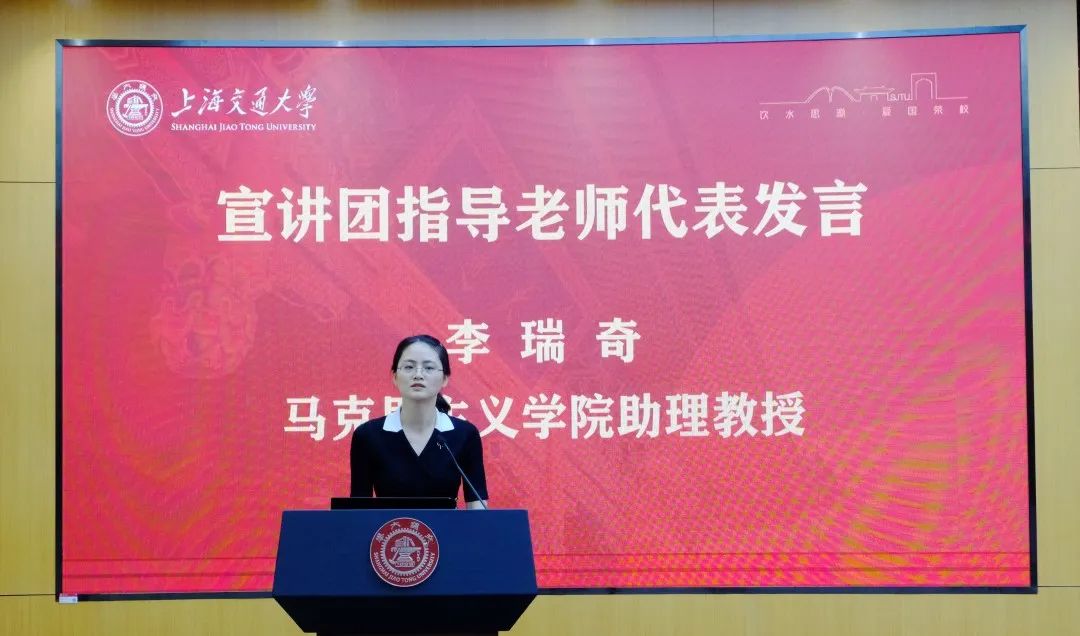 李瑞奇代表指导老师发言。她表示,宣讲团成员要从思想学习、党性锤练、具体实践三重维度不断提升自己,充分发挥交大青年在专业上的理论优势、在资源上的协同优势、在宣讲中的青春优势,推动理论宣讲入脑入心,转化为奋斗实践,努力在新时代基层理论宣讲的创新性发展与创造性转化上再建新功。
